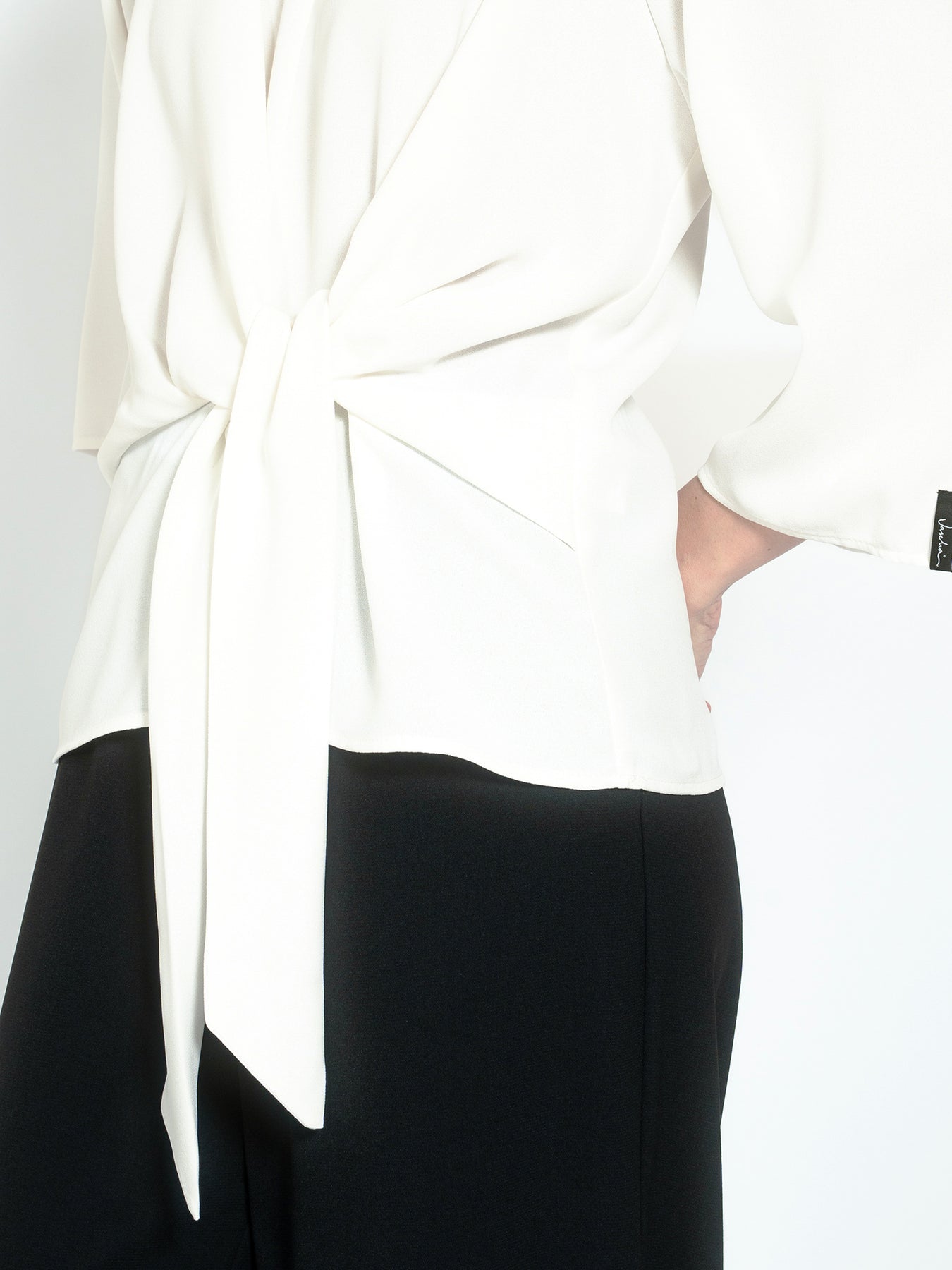 Blouse in soft recycled polyester from Jascha Stockholm. Draped model with decorative tie at the front and wide three-quarter sleeves The blouse has an invisible zip at back.