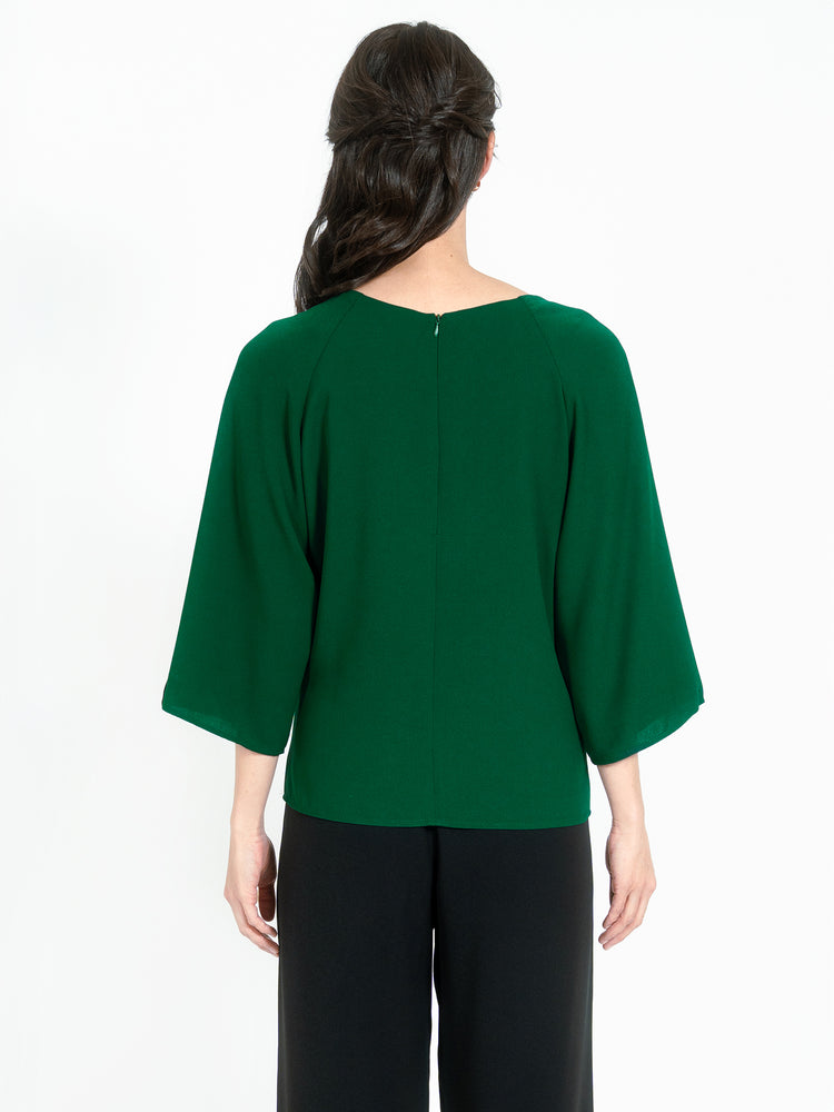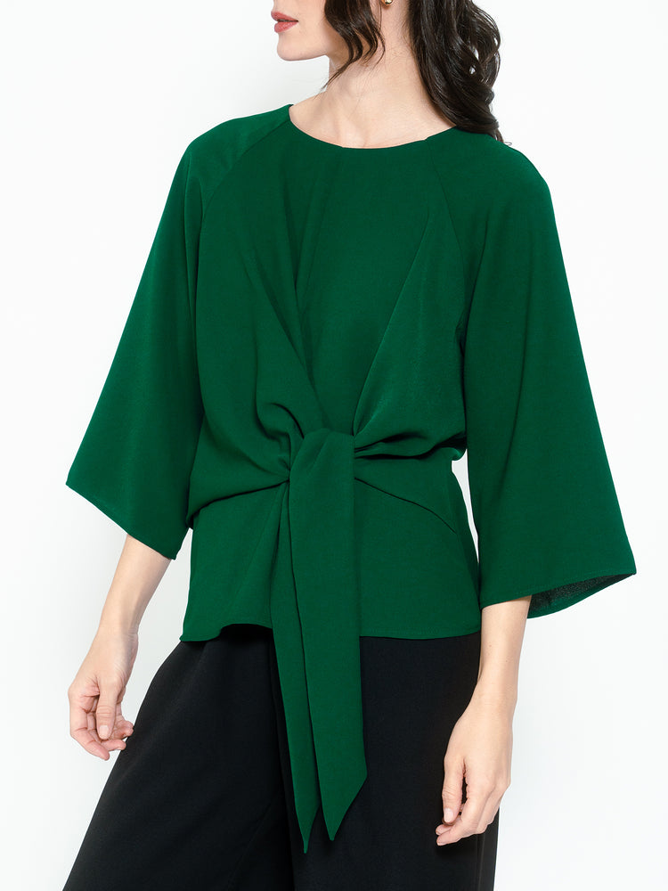 Blouse in soft recycled polyester from Jascha Stockholm. Draped model with decorative tie at the front and wide three-quarter sleeves The blouse has an invisible zip at back.