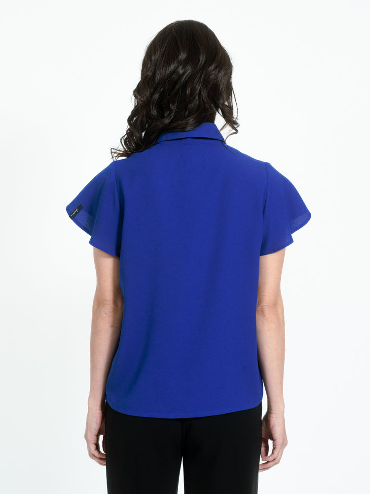 Blouse in soft recycled polyester from Jascha Stockholm. Short model with a straight fit and short butterfly sleeves. The blouse has a shirt collar and a short and hidden zipper at front.