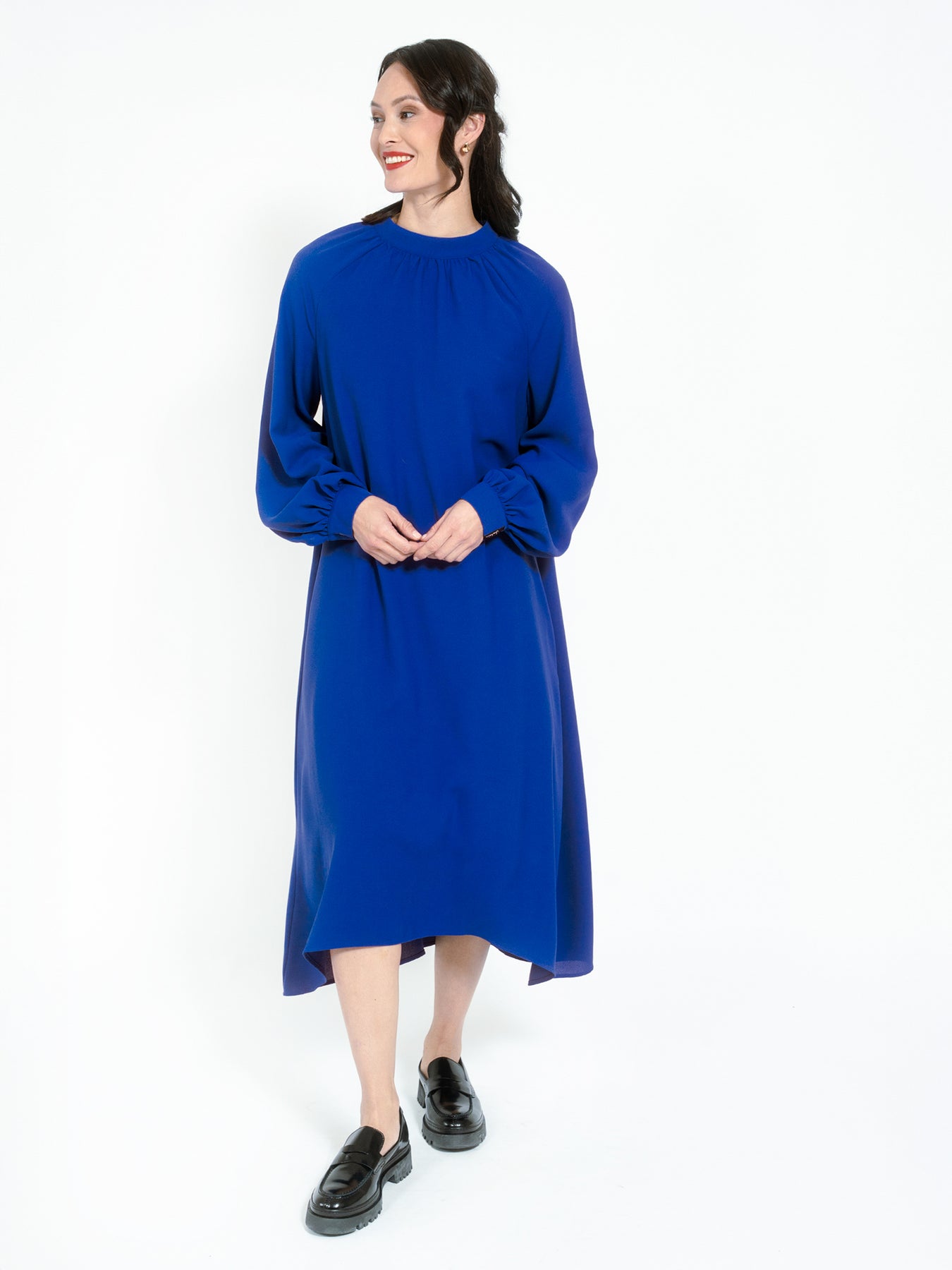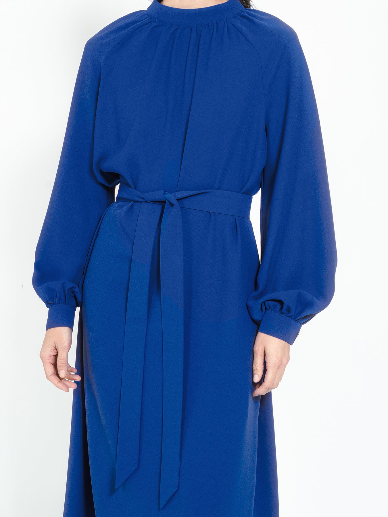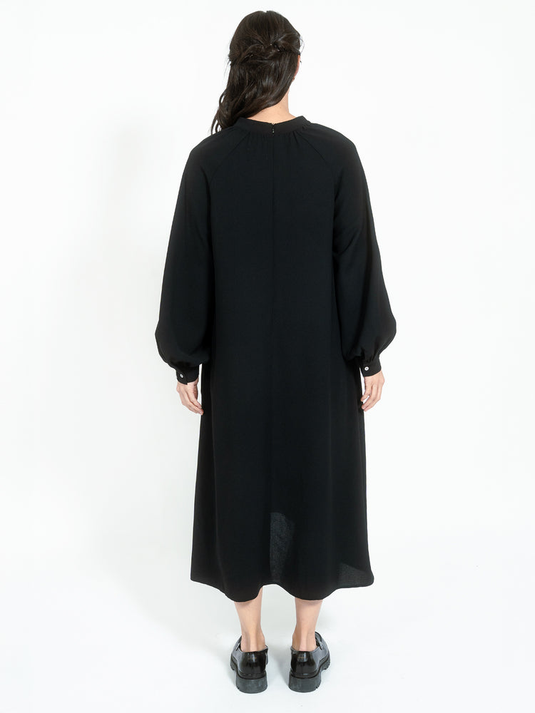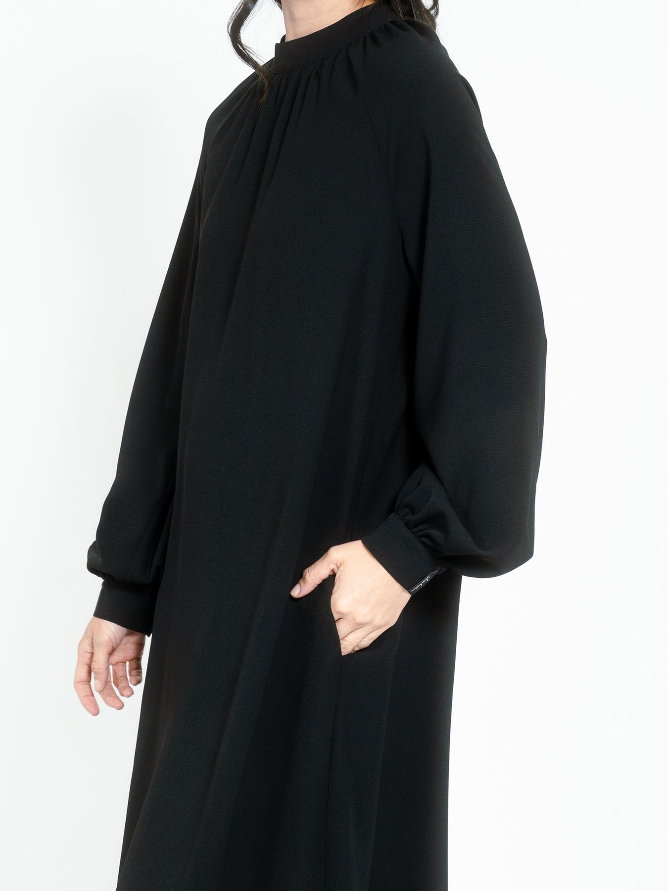 Ancle length dress in soft recycled polyester from Jascha Stockholm. Straight model with a discreet collar and long sleeves with buttons at cuffs. The dress has a waistband and pockets in the sides and a hidden zipper at back.