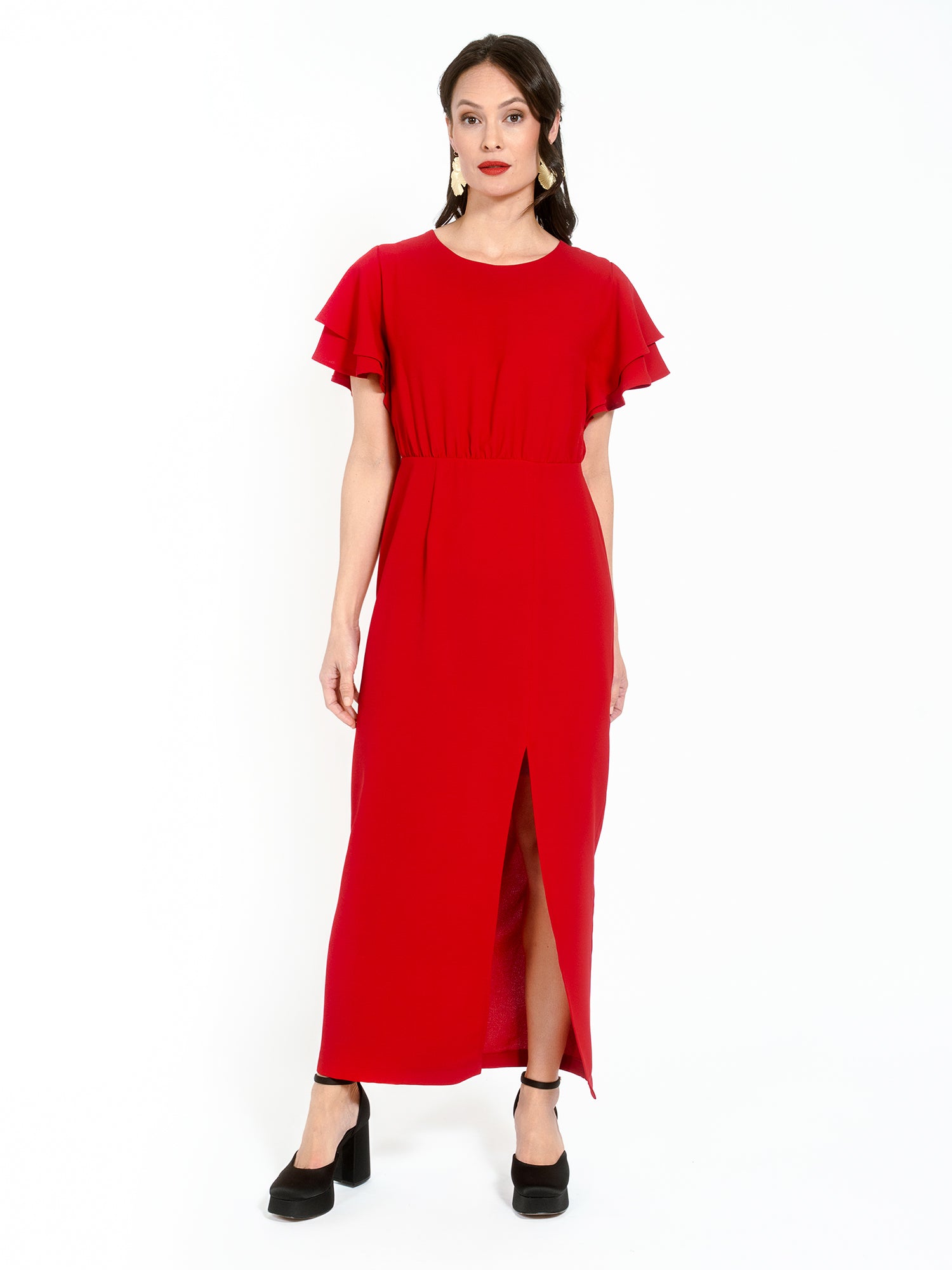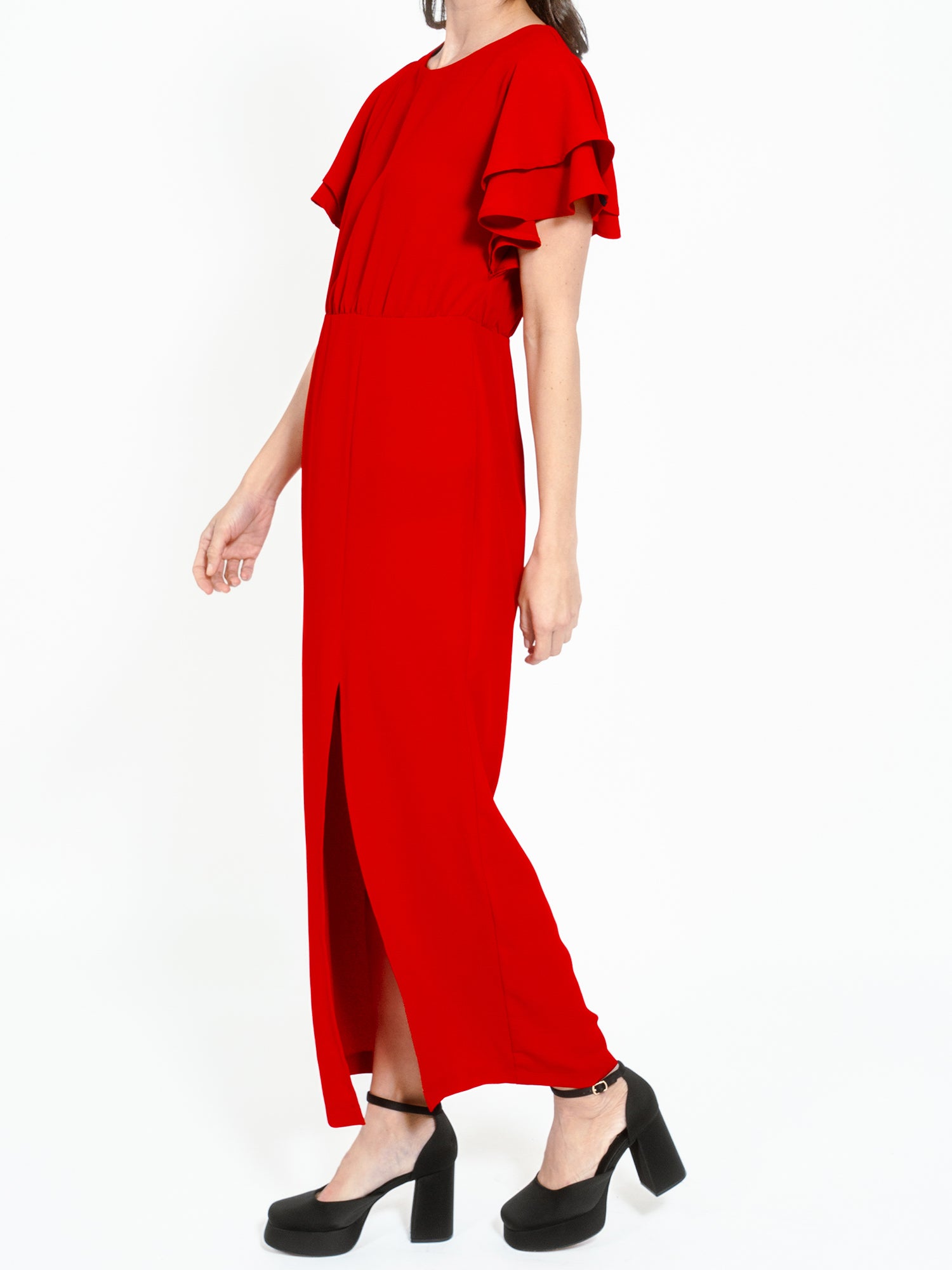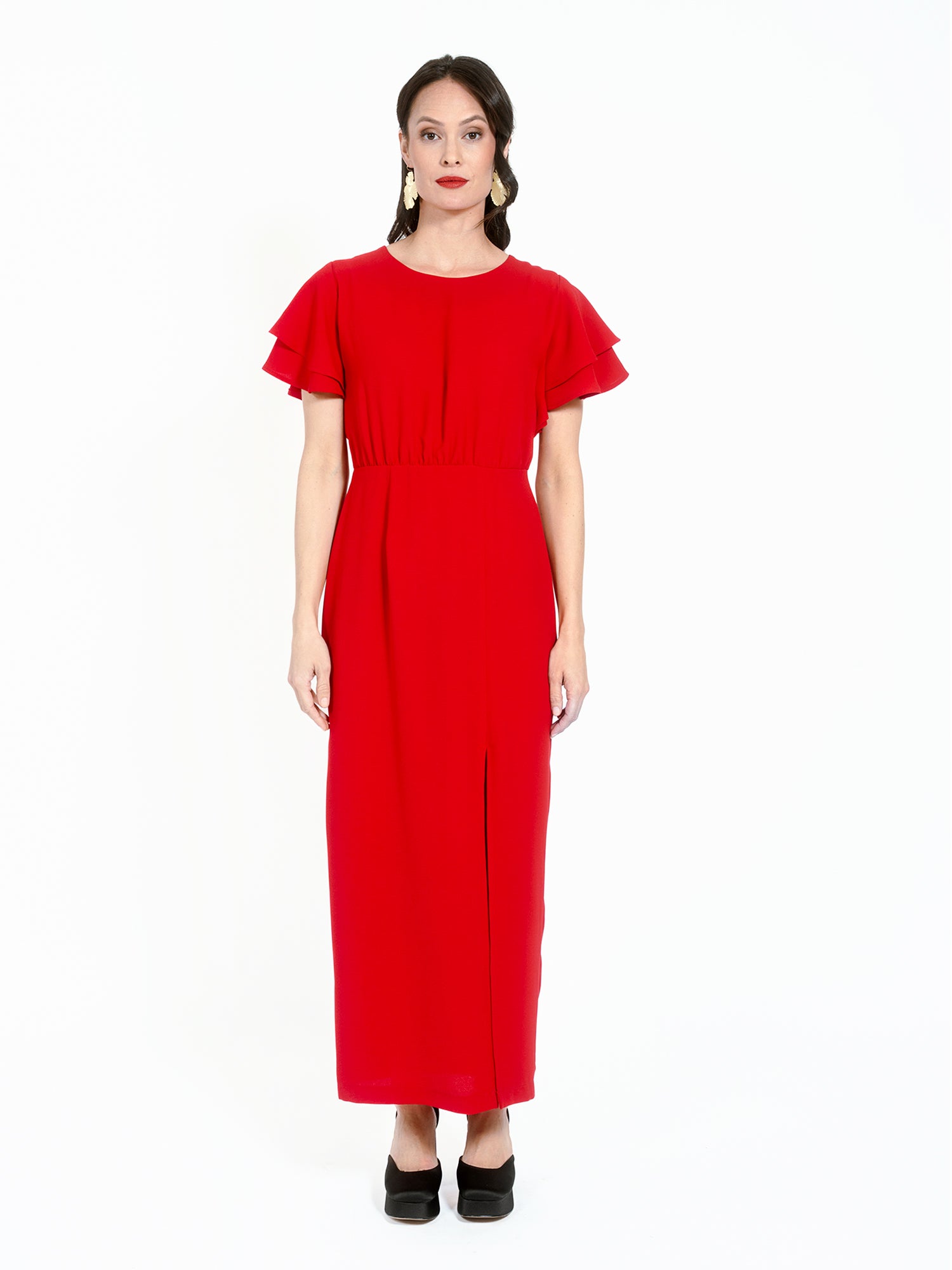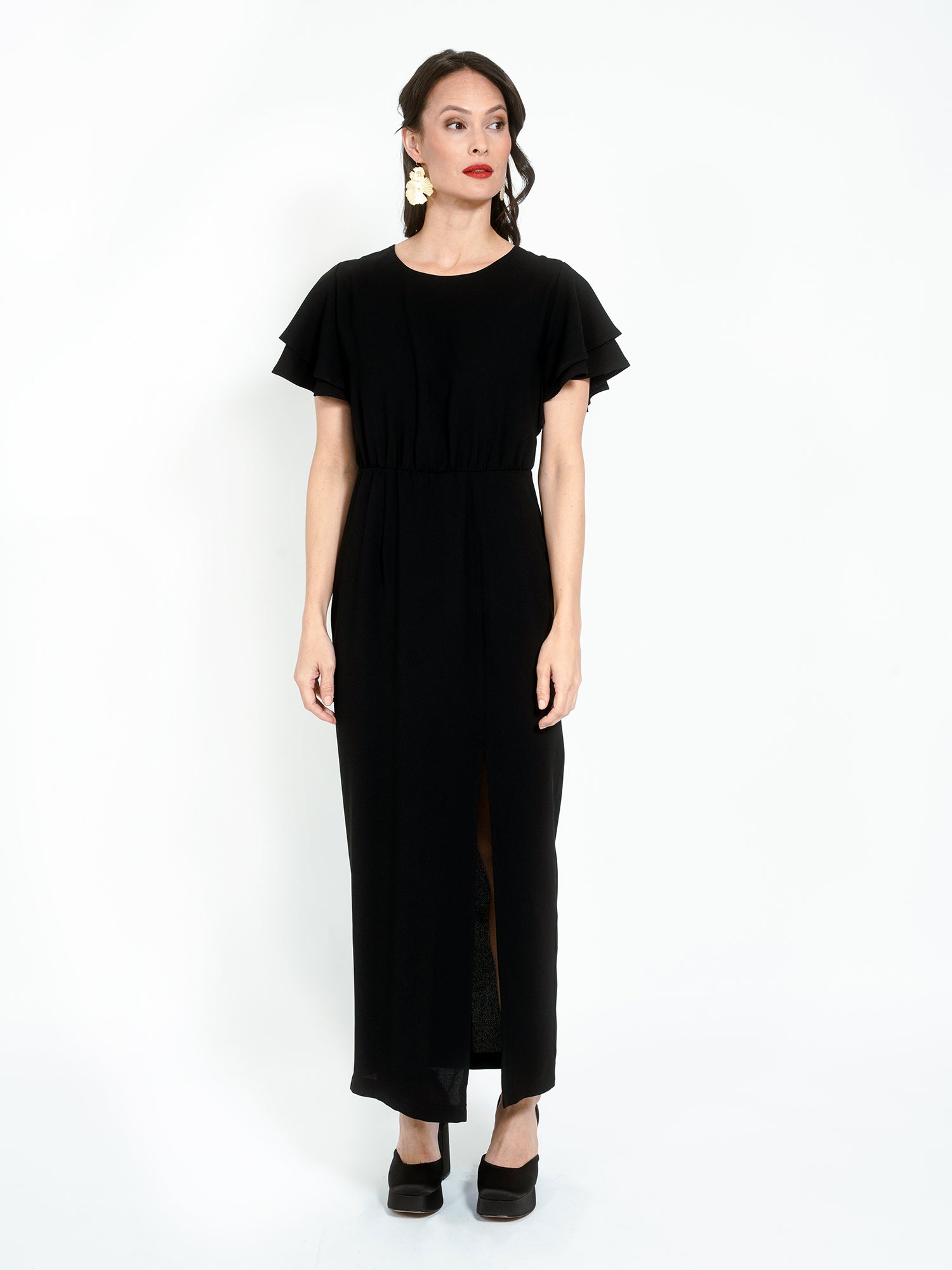 Ancle length dress in soft recycled polyester from Jascha Stockholm. Slim model with a defined waist and a long slit at the front. The dress has short butterfly sleeves in double layers, as well as a hidden zipper at the back.