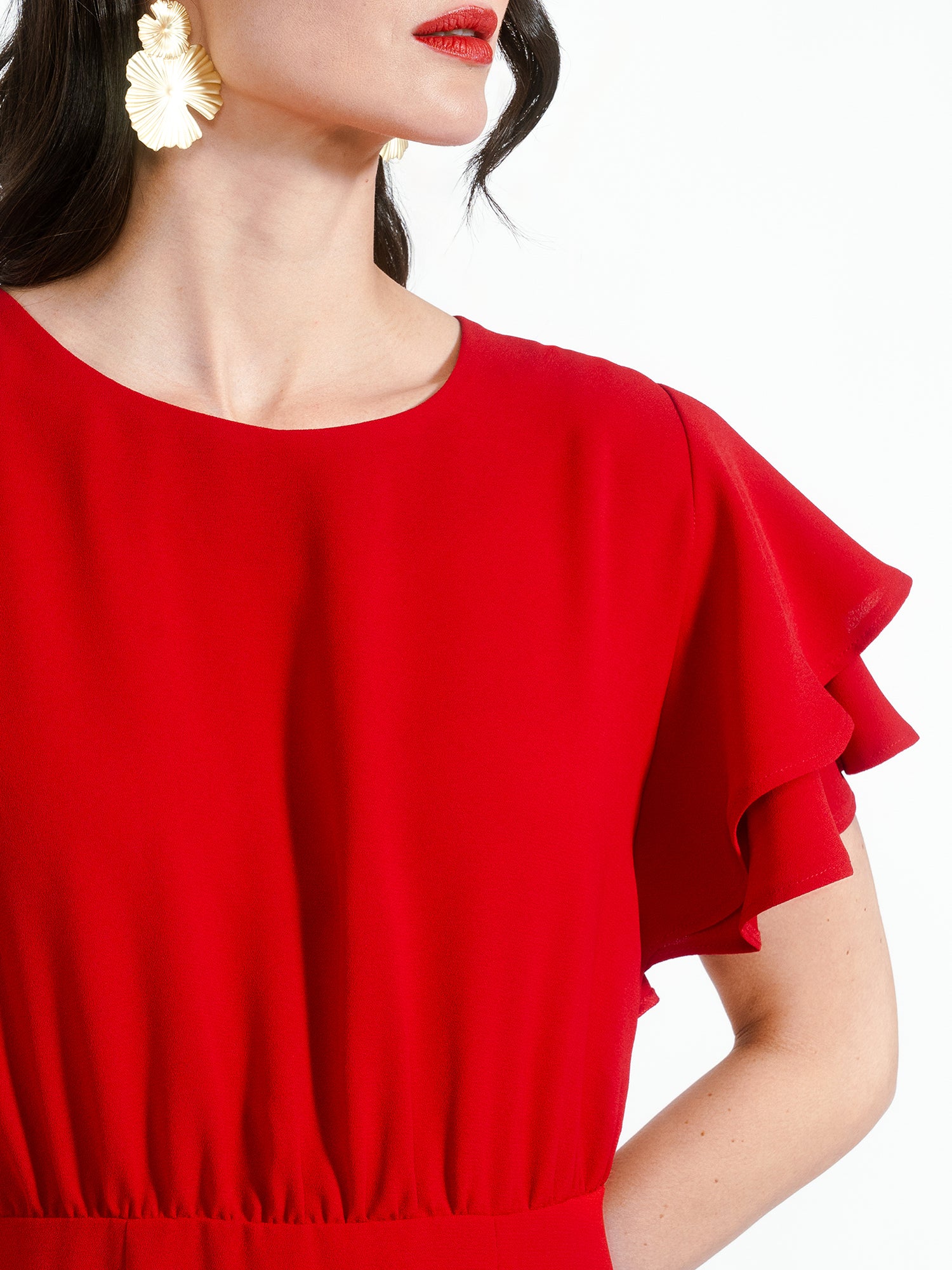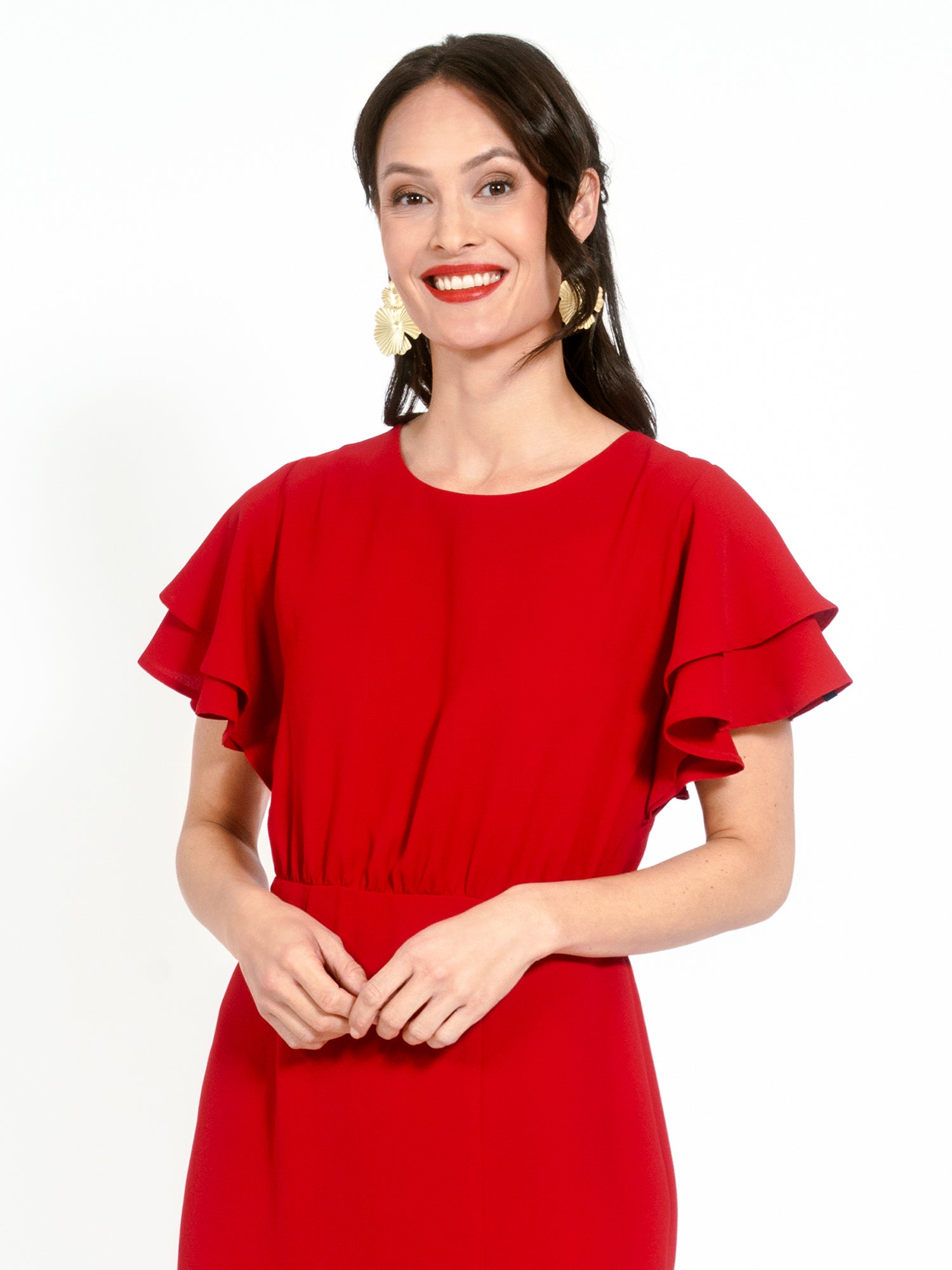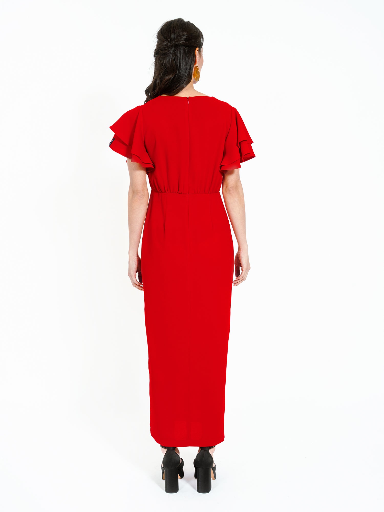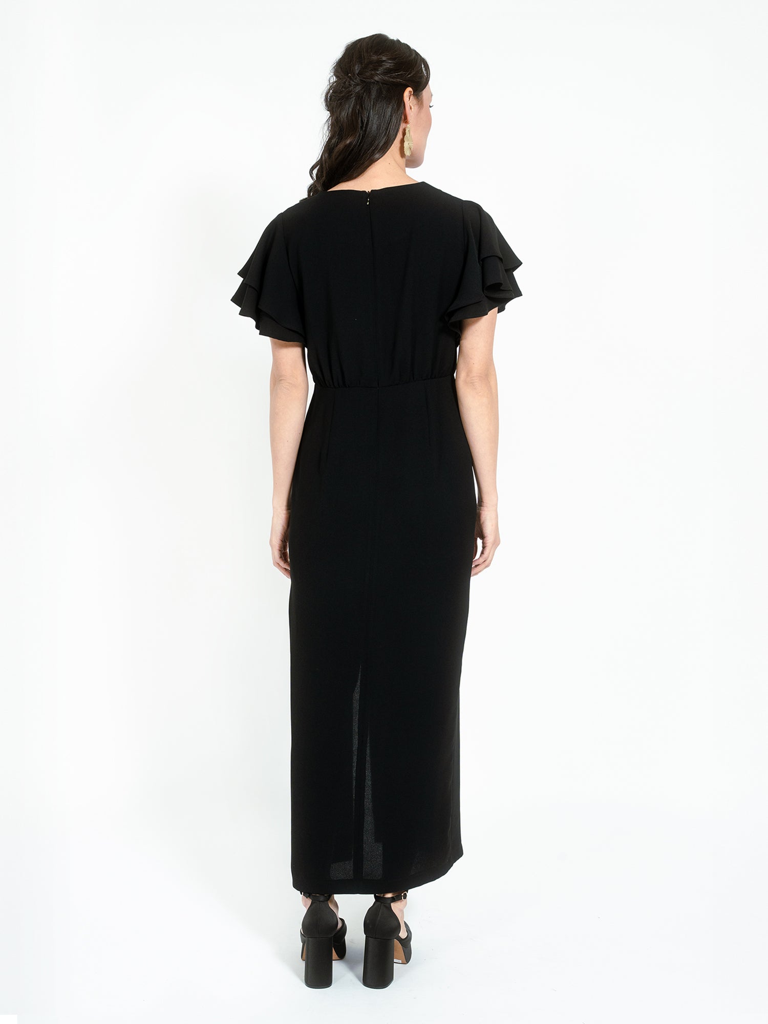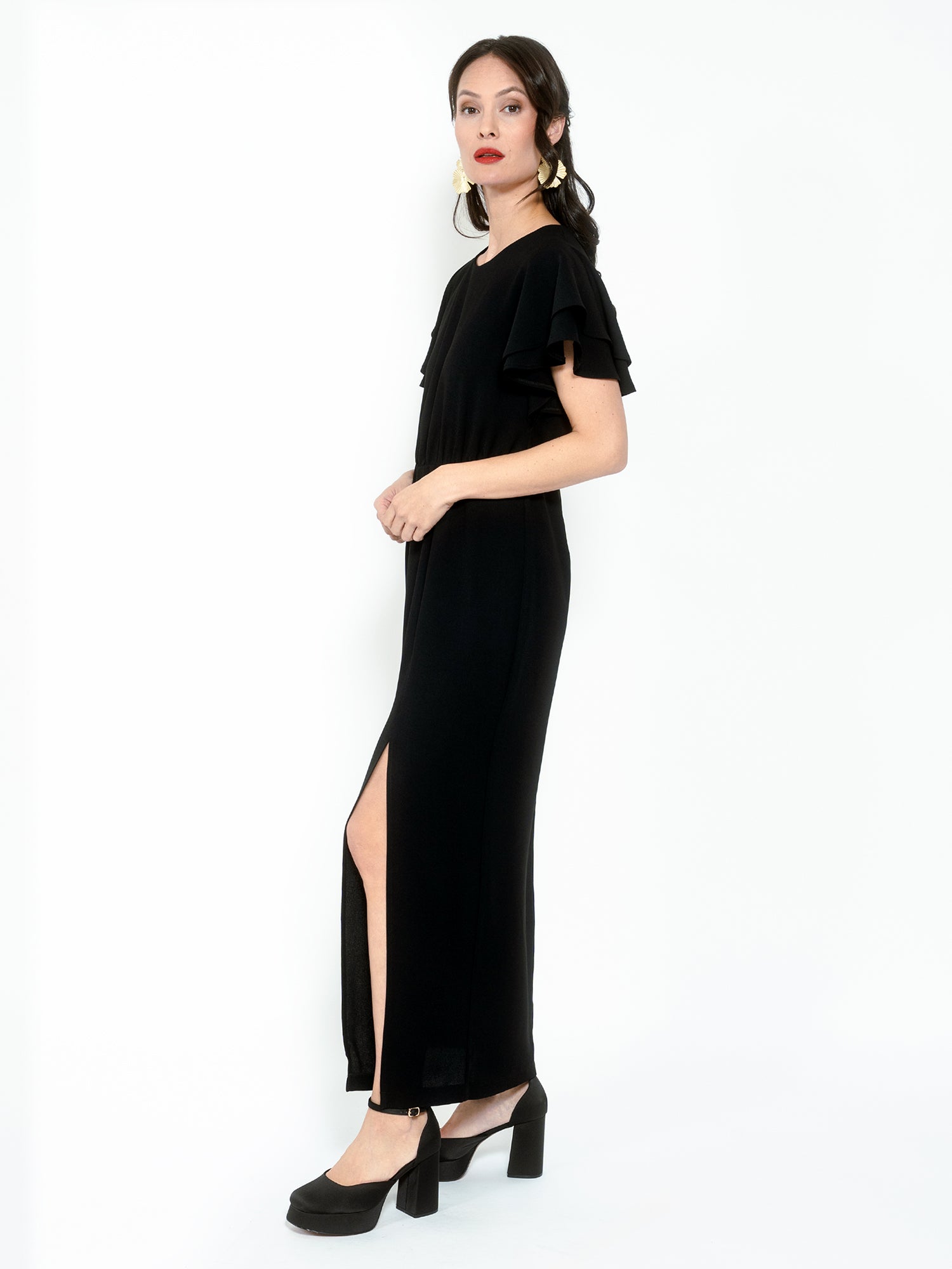 Ancle length dress in soft recycled polyester from Jascha Stockholm. Slim model with a defined waist and a long slit at the front. The dress has short butterfly sleeves in double layers, as well as a hidden zipper at the back.
