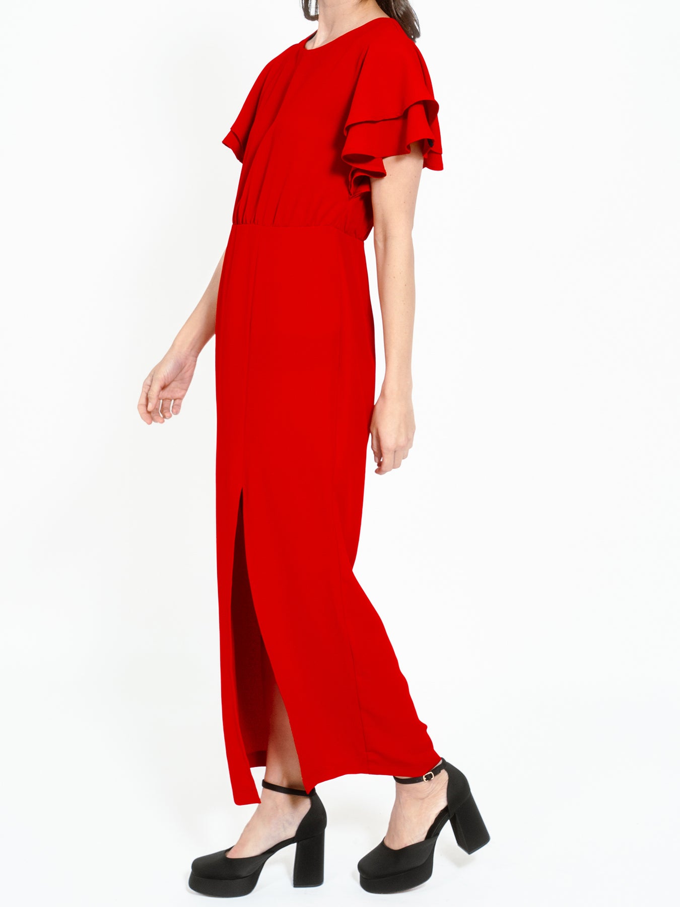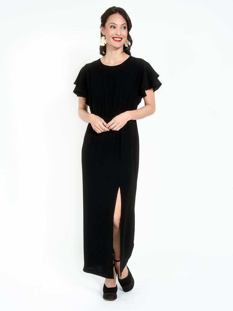 Ancle length dress in soft recycled polyester from Jascha Stockholm. Slim model with a defined waist and a long slit at the front. The dress has short butterfly sleeves in double layers, as well as a hidden zipper at the back.
