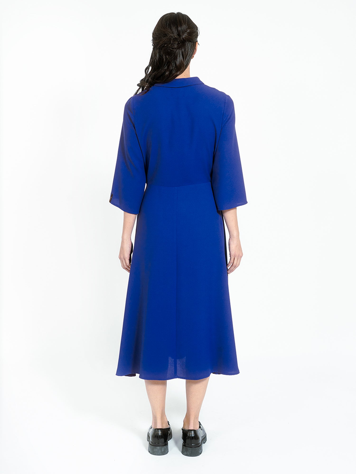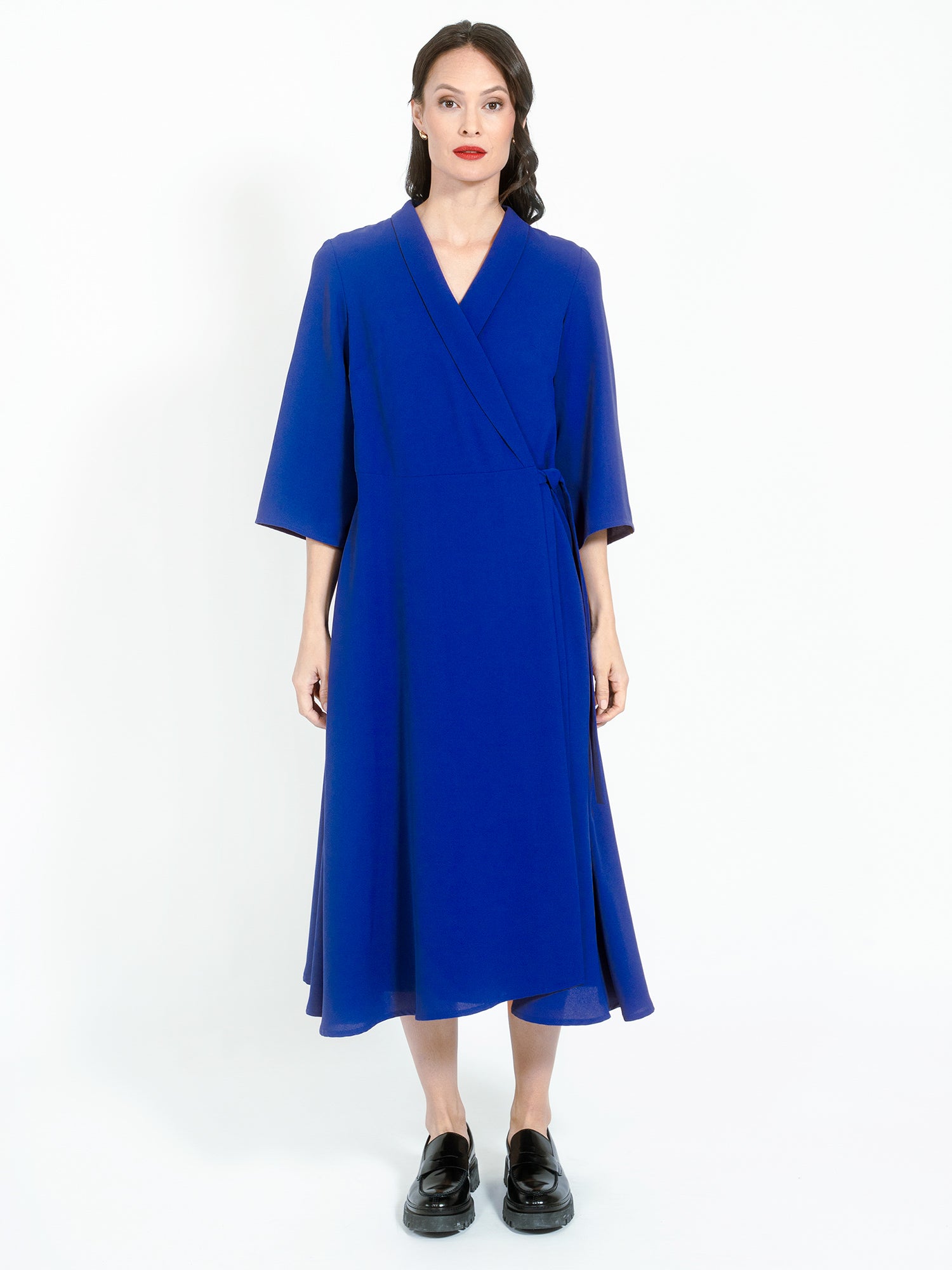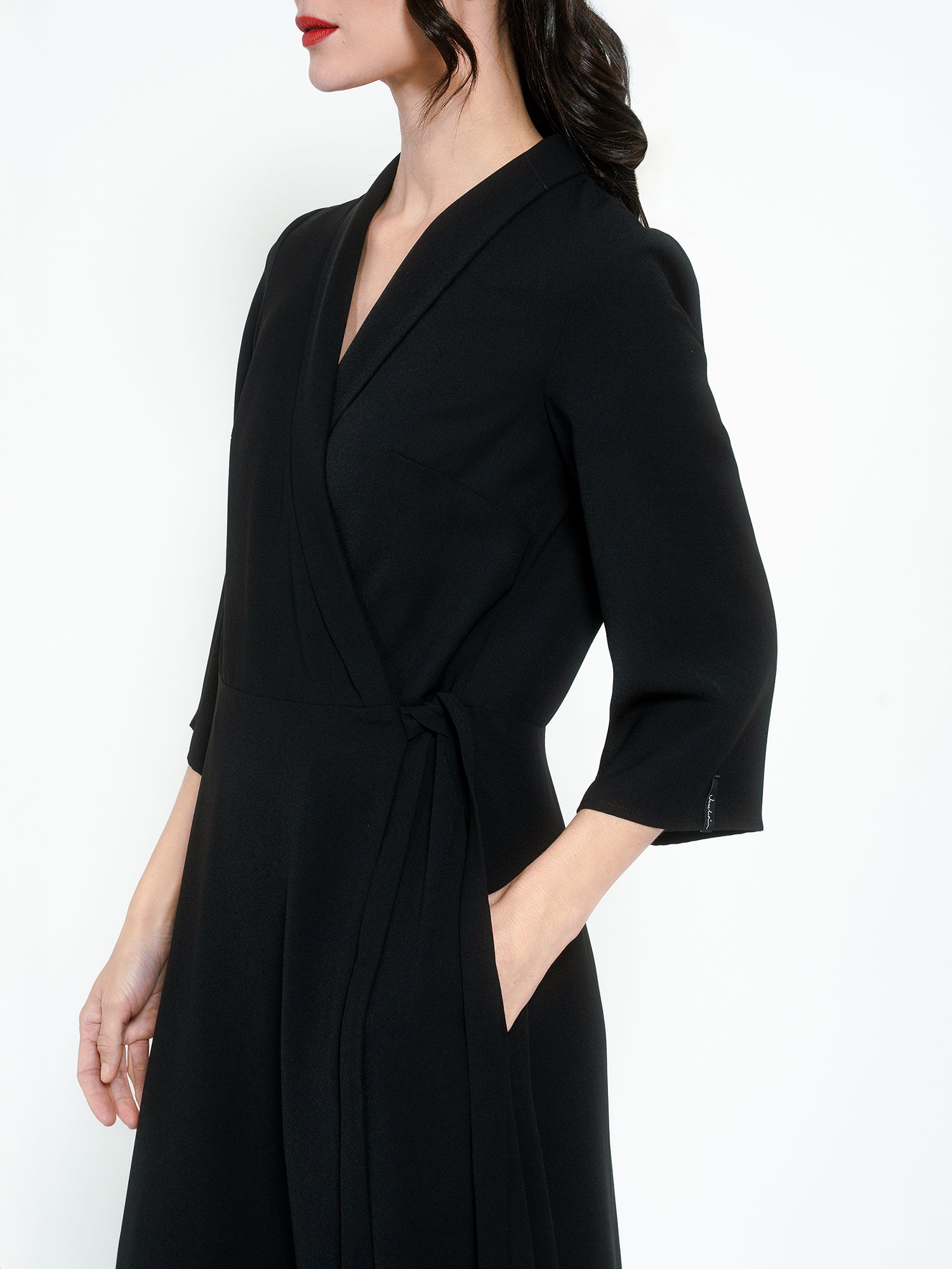 Dress in soft recycled polyester from Jascha Stockholm from Jascha Stockholm. Wrap around model with ancle length fit. The dress has a waist band and three-quarter length sleeves.