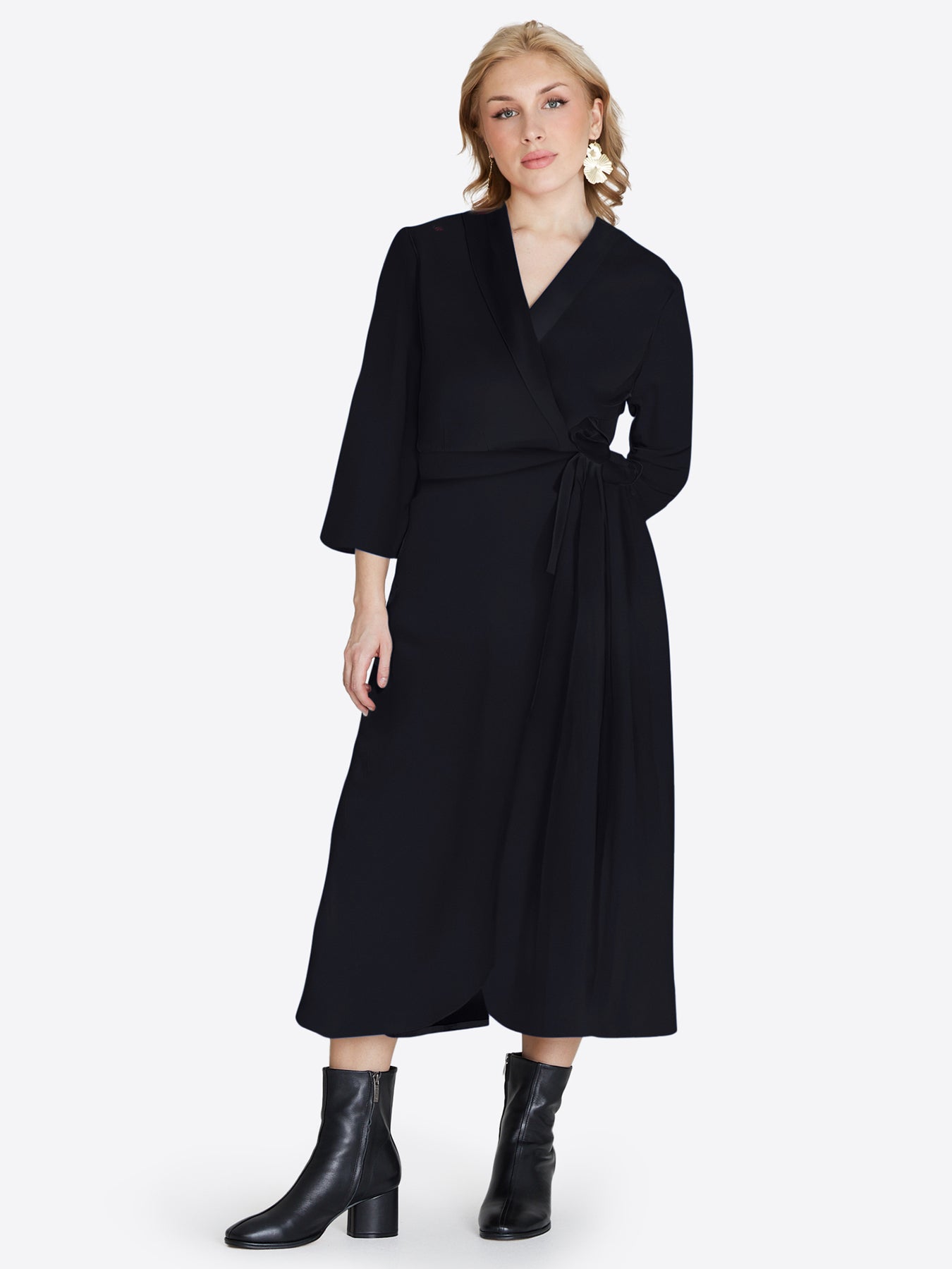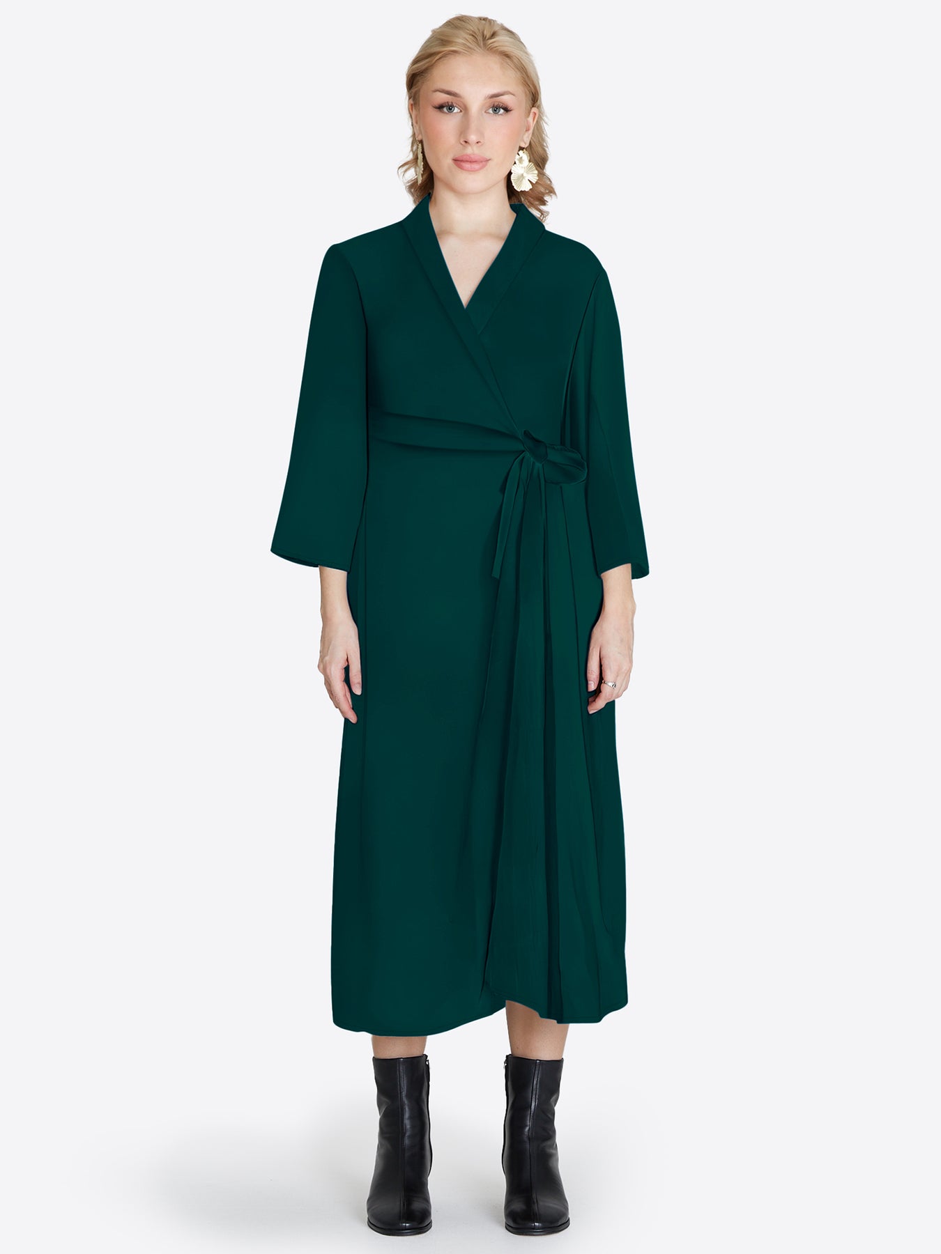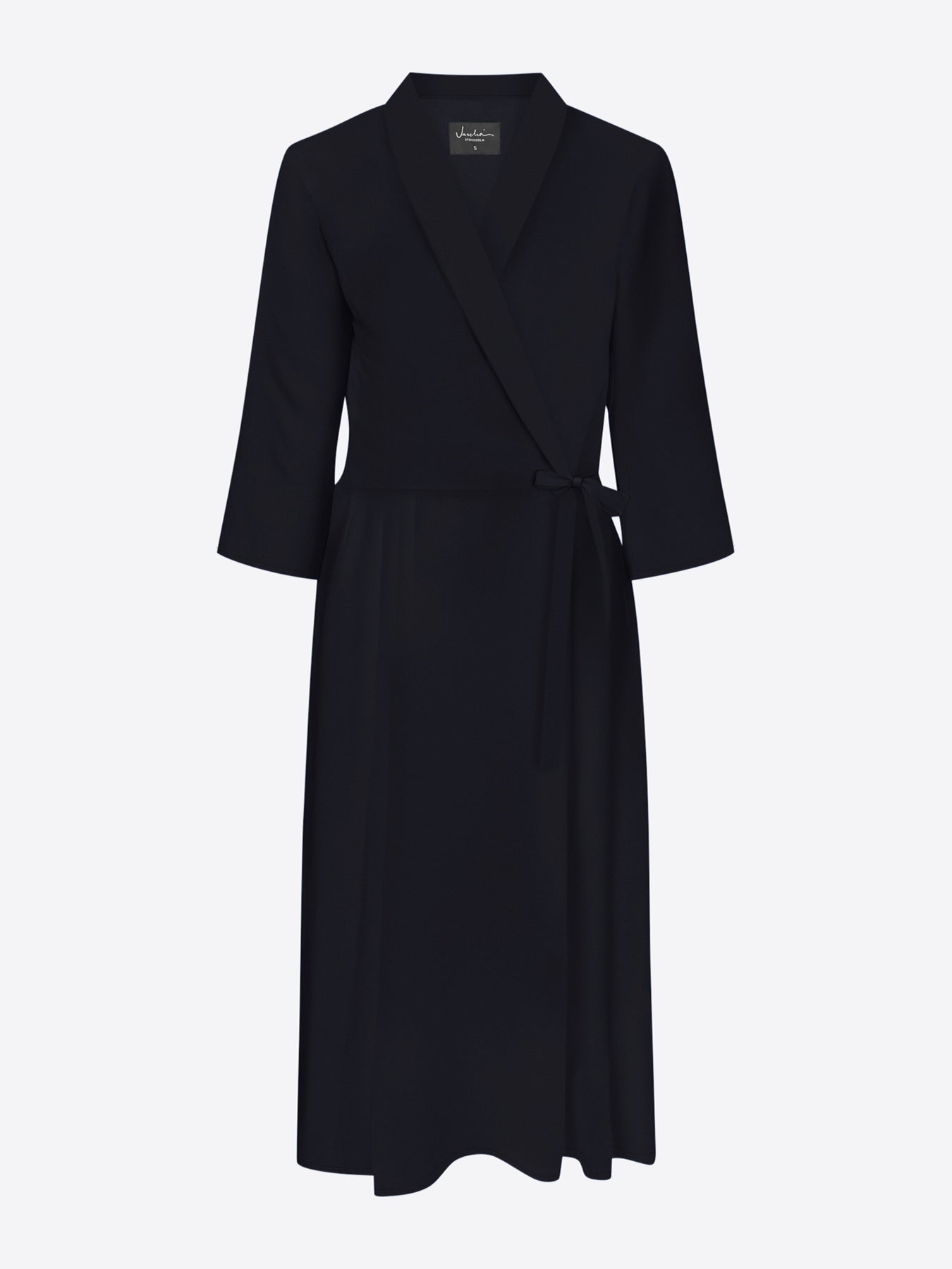 Dress in soft recycled polyester from Jascha Stockholm from Jascha Stockholm. Wrap around model with ancle length fit. The dress has a waist band and three-quarter length sleeves.