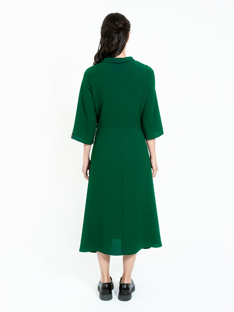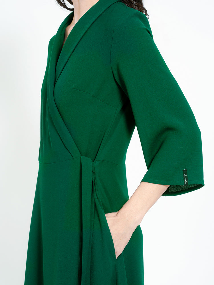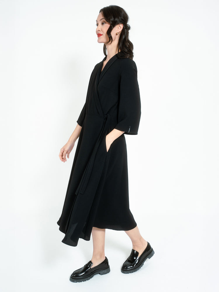 Dress in soft recycled polyester from Jascha Stockholm from Jascha Stockholm. Wrap around model with ancle length fit. The dress has a waist band and three-quarter length sleeves.