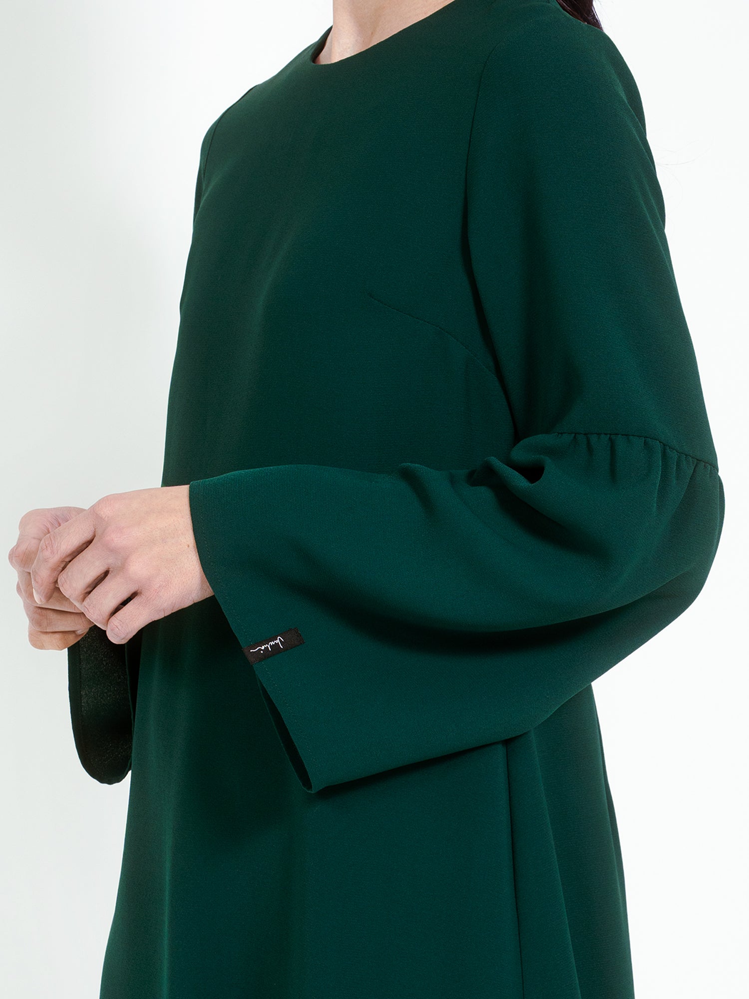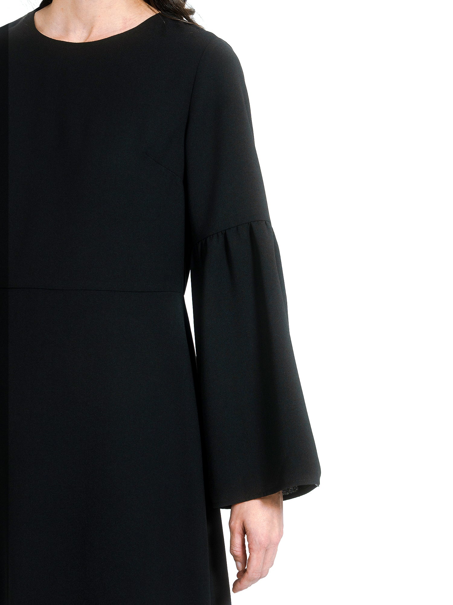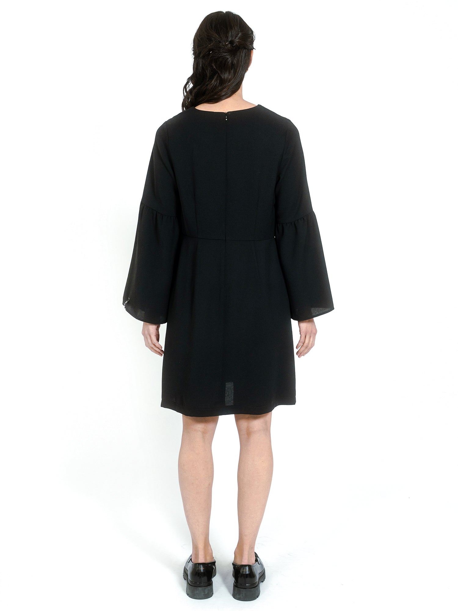 Knee-length dress in soft recycled polyester from Jascha Stockholm. Slightly slimmer model with a defined waist and long, wide trumpet sleeve. The dress has a hidden zipper at back.