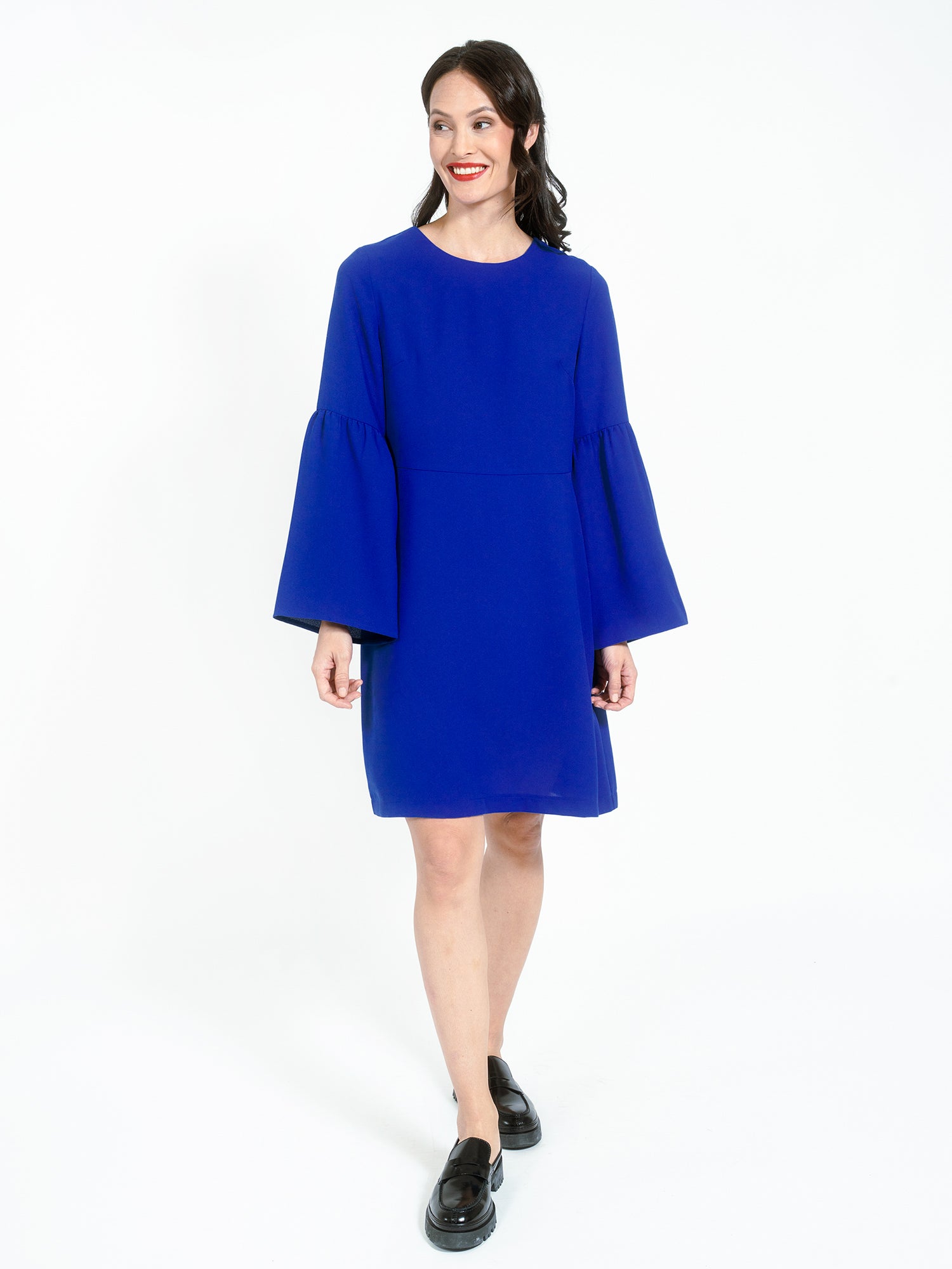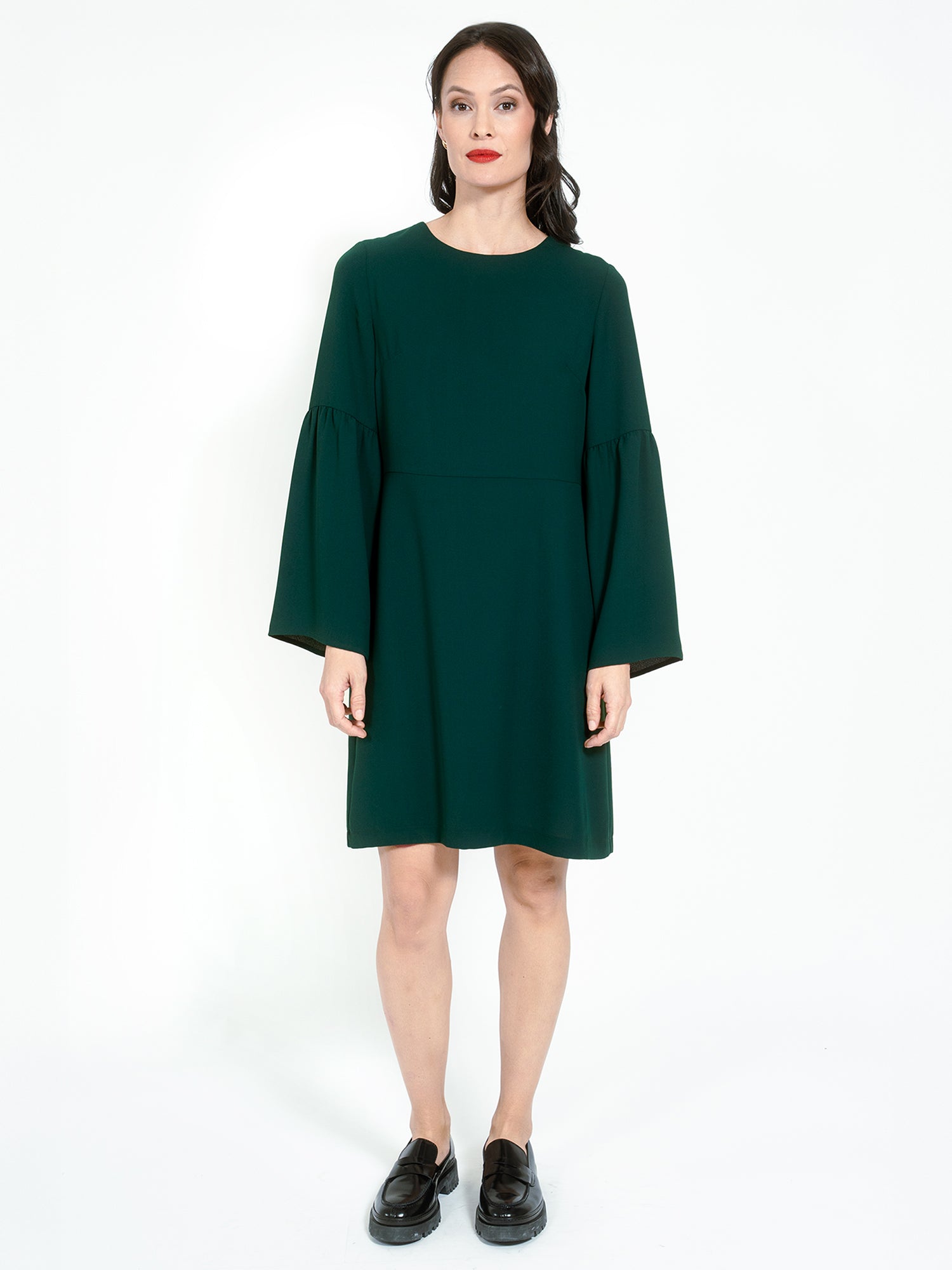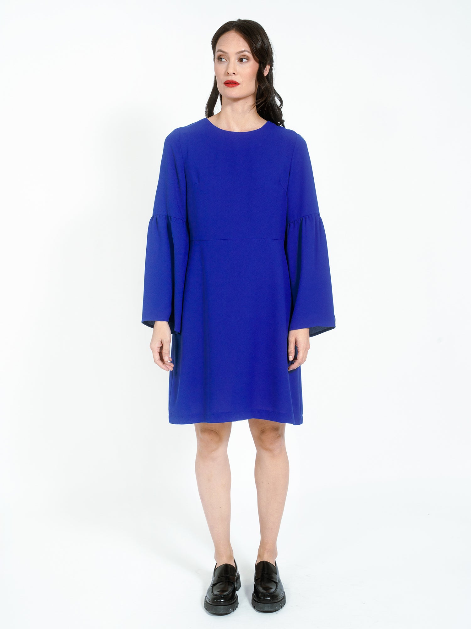 Knee-length dress in soft recycled polyester from Jascha Stockholm. Slightly slimmer model with a defined waist and long, wide trumpet sleeve. The dress has a hidden zipper at back.