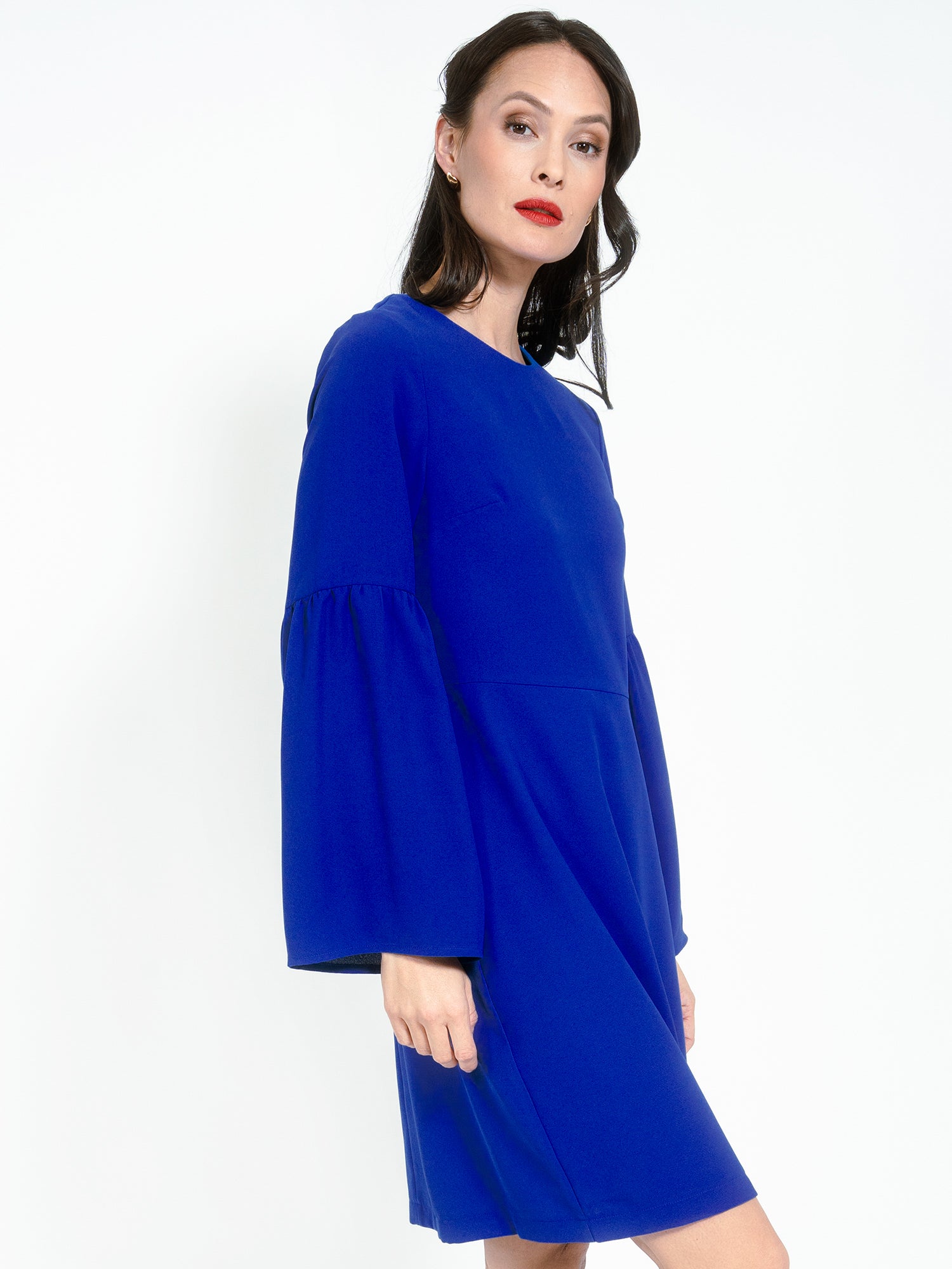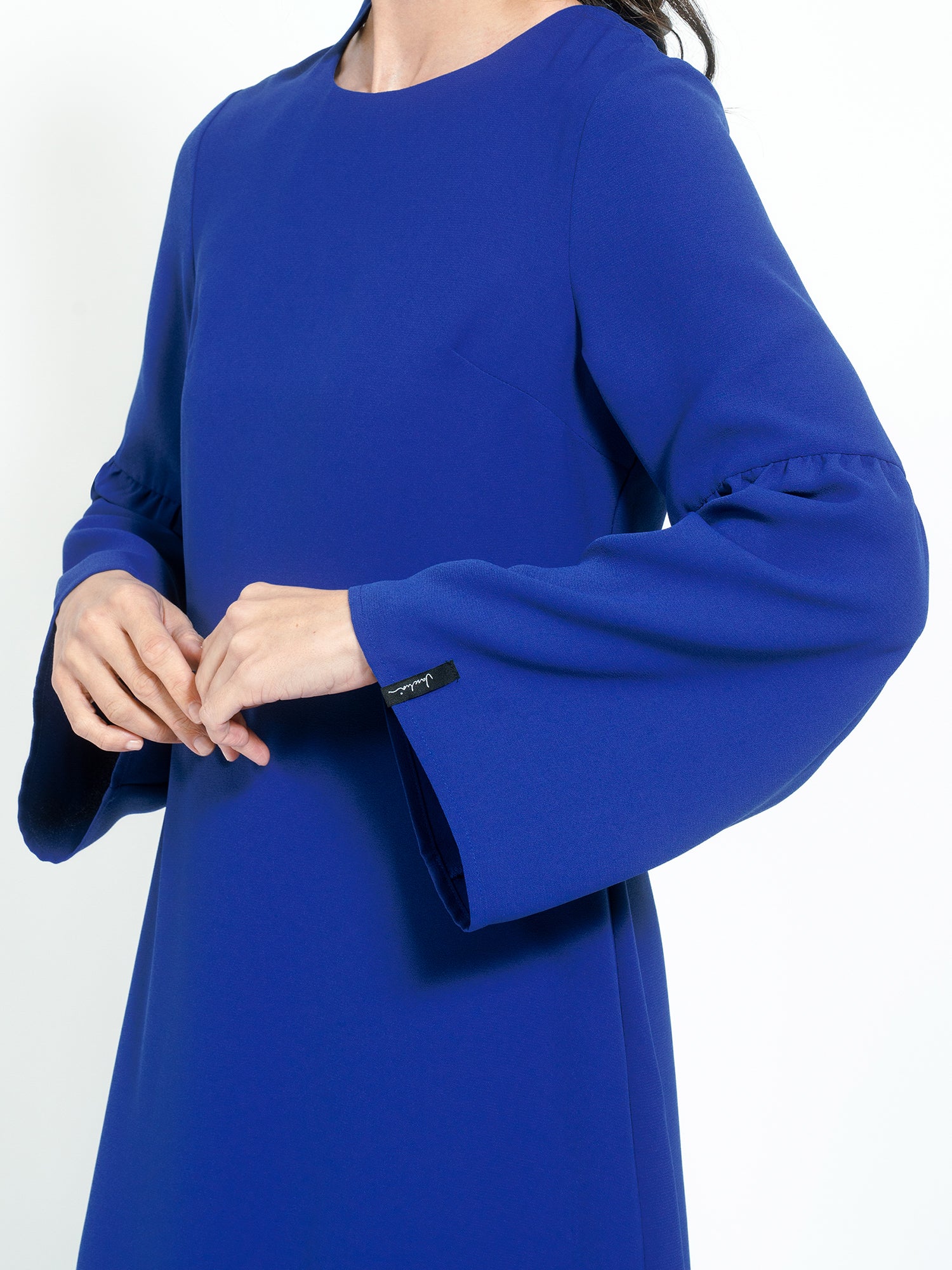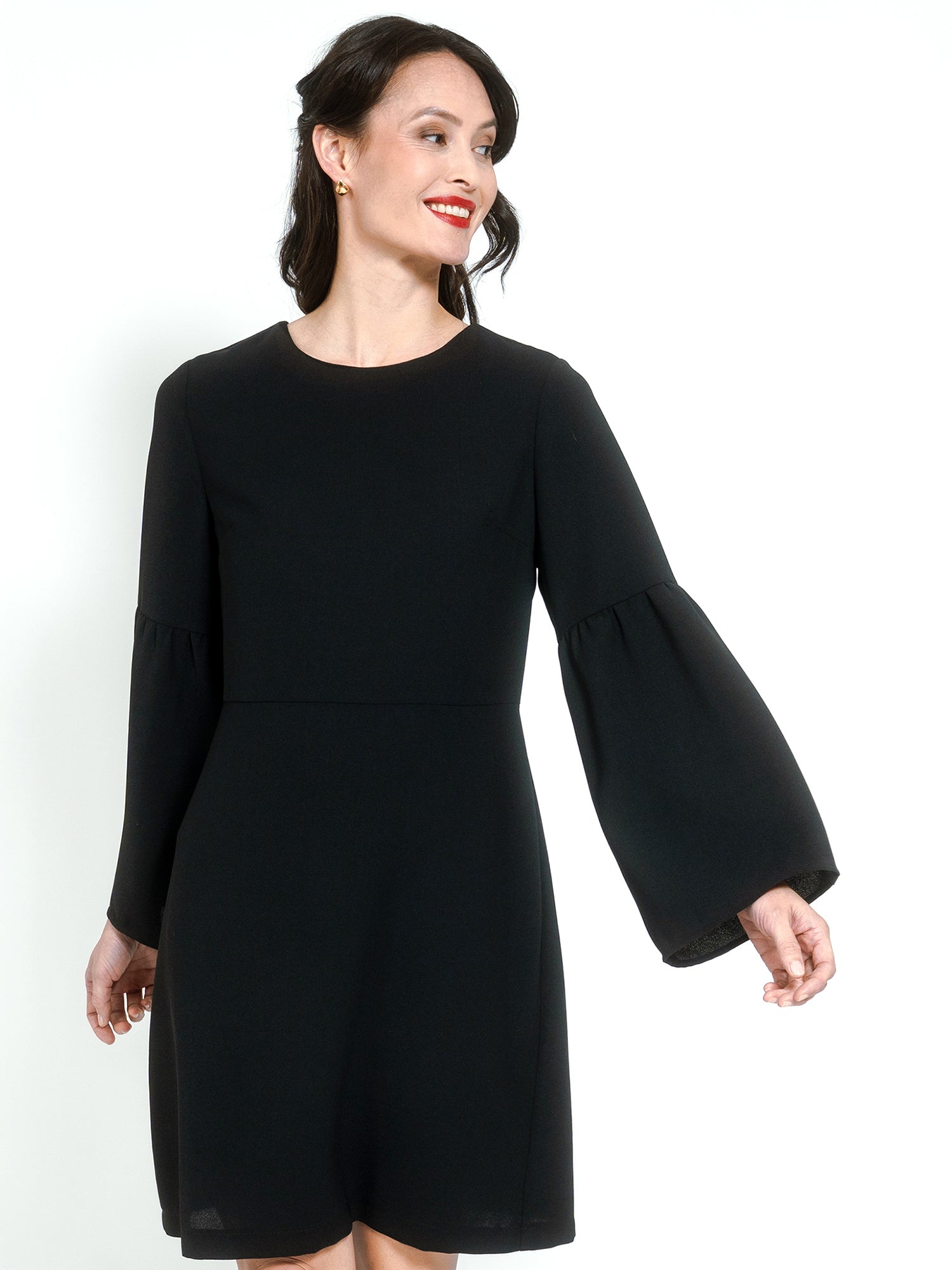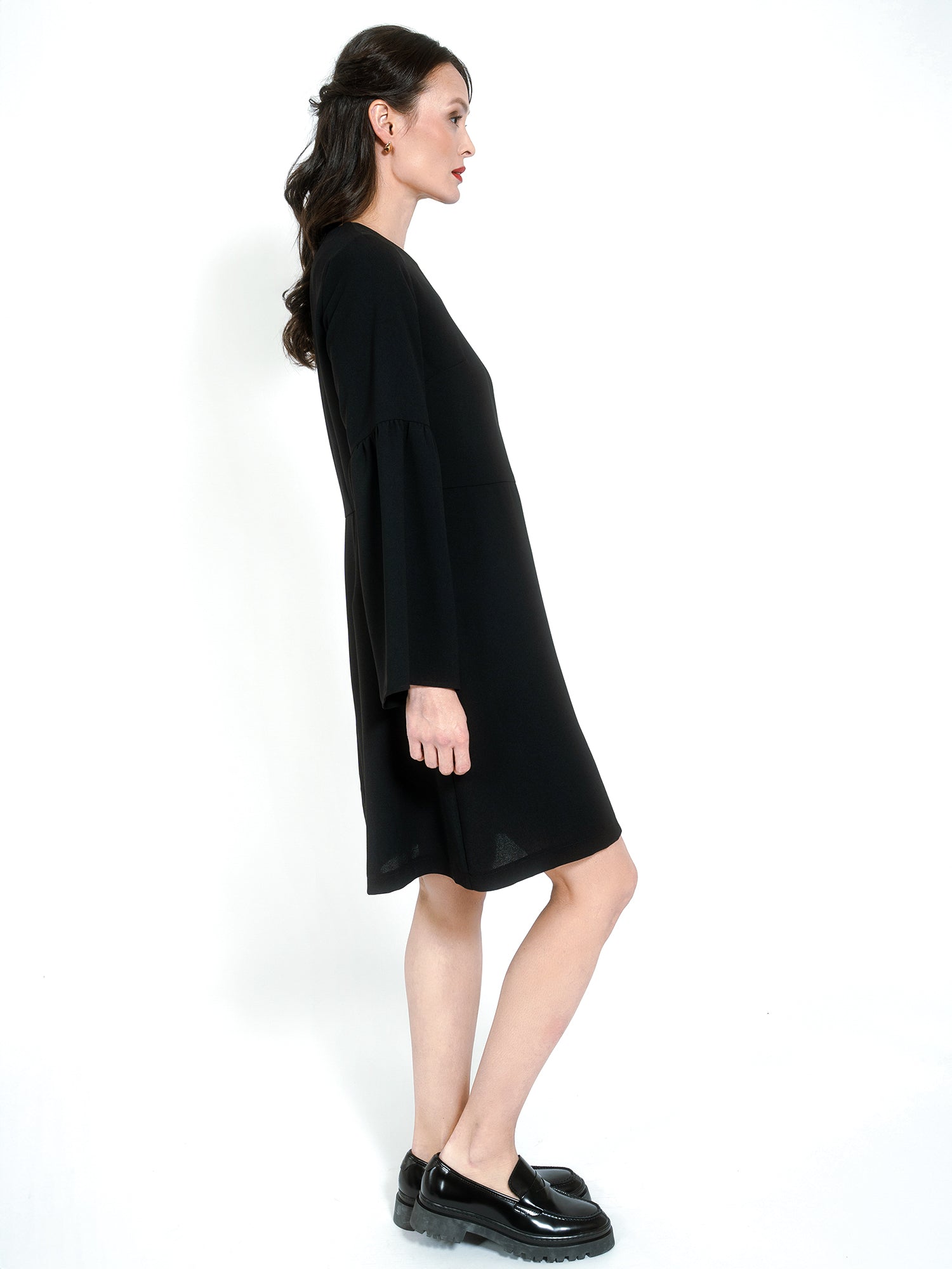 Knee-length dress in soft recycled polyester from Jascha Stockholm. Slightly slimmer model with a defined waist and long, wide trumpet sleeve. The dress has a hidden zipper at back.